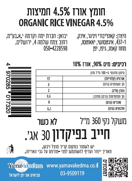 חומץ אורז טהור אורגני מוסמך איגוד ה-Japanese Agricultural Standards (JAS).
