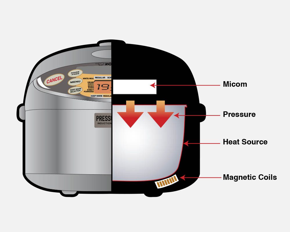 - לחץ + IH + Micom טכנולוגיית בישול אופטימלי שילוב של לחץ וחום גבוה משפר את הטעם ומשפר את מרקם האורז. השרייה ואידוי מתוכנתים מראש.